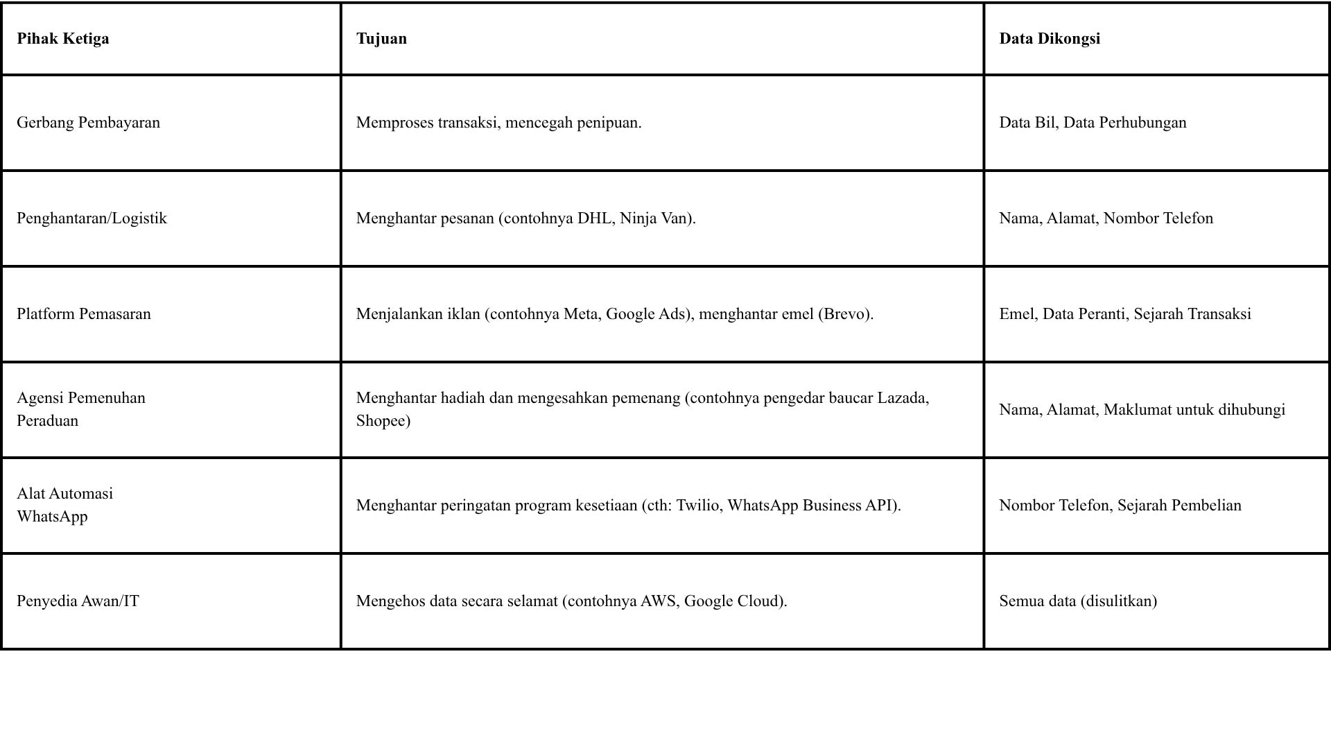 (c) kepada Pihak Ketiga yang mungkin menerima data peribadi untuk memproses data tersebut di bawah arahan yang sewajarnya bagi tujuan pemprosesan seperti yang dinyatakan di atas, termasuk tetapi tidak terhad kepada [·]: