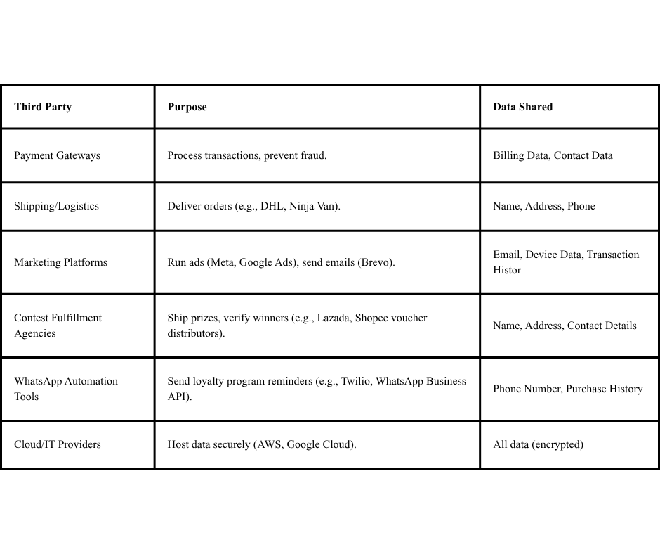 (b). Third Parties: Certain third parties, whether affiliated or unaffiliated (“Third Parties“) may collect Personal Data from you and circulate the same to us subject to their compliance with their privacy policies and the PDPA.
